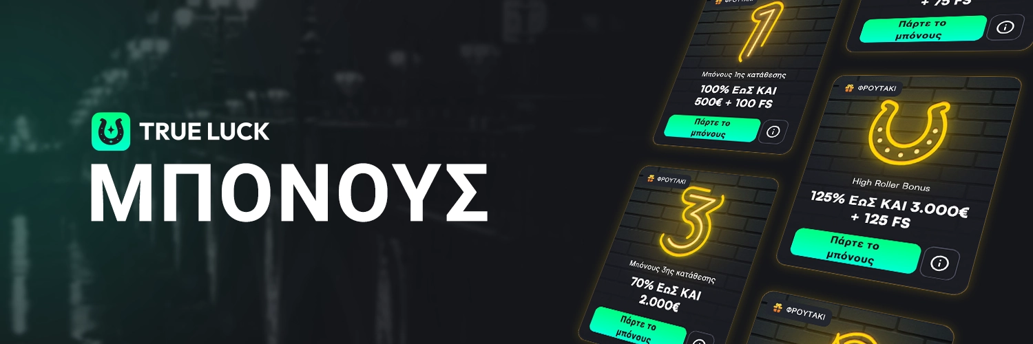 Στο Trueluck οι προσφορές μας καλύπτουν διαφορετικά στυλ παιχνιδιού: πακέτα καλωσορίσματος για παιχνίδι με κουλοχέρηδες και ζωντανά τραπέζια, ειδικό μπόνους για High Roller παίκτες, εβδομαδιαίο Μπόνους του ΣΚ και Επιστροφή χρημάτων που είναι ανάλογη με το επίπεδο VIP του παίκτη.